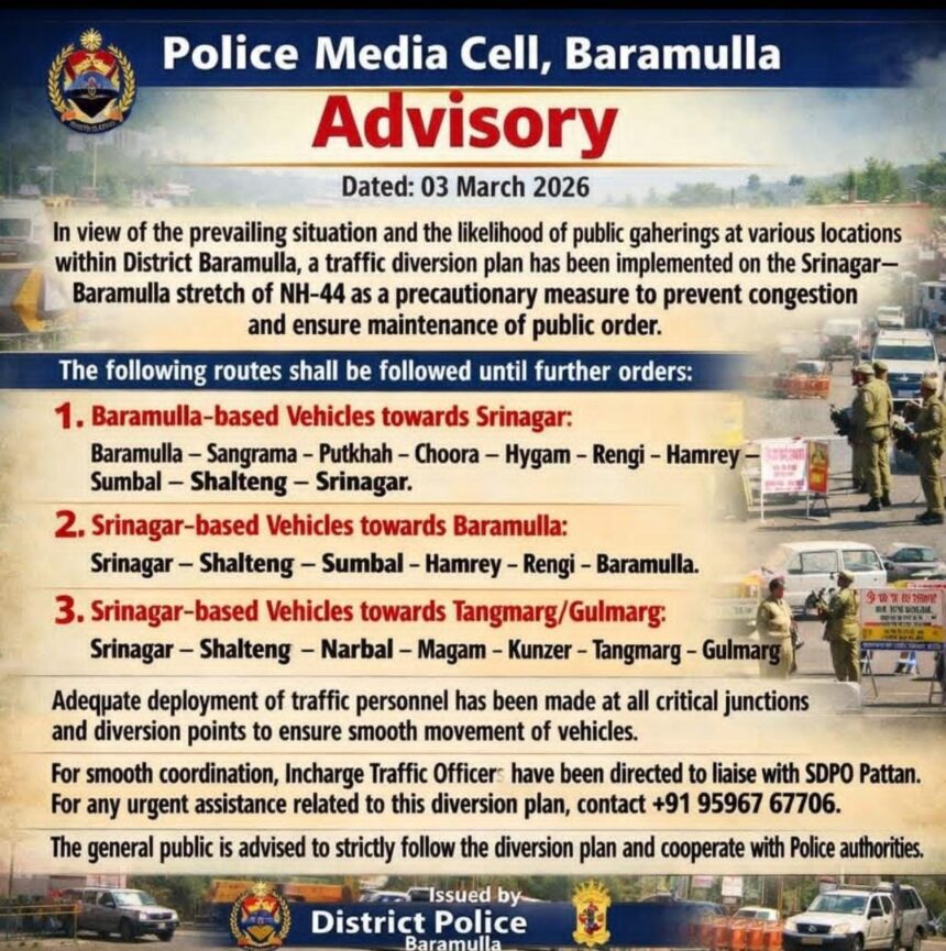 According to the diversion plan, vehicles from Baramulla travelling towards Srinagar will be routed via Baramulla–Sangrama–Putkhah–Choora–Hygam–Rengi–Hamrey–Sumbal–Shalteng.